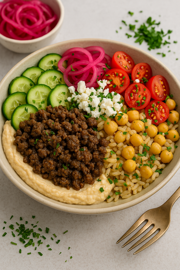 A balanced, flavorful dish featuring lean ground beef, chickpeas, fresh vegetables, and herbs.
